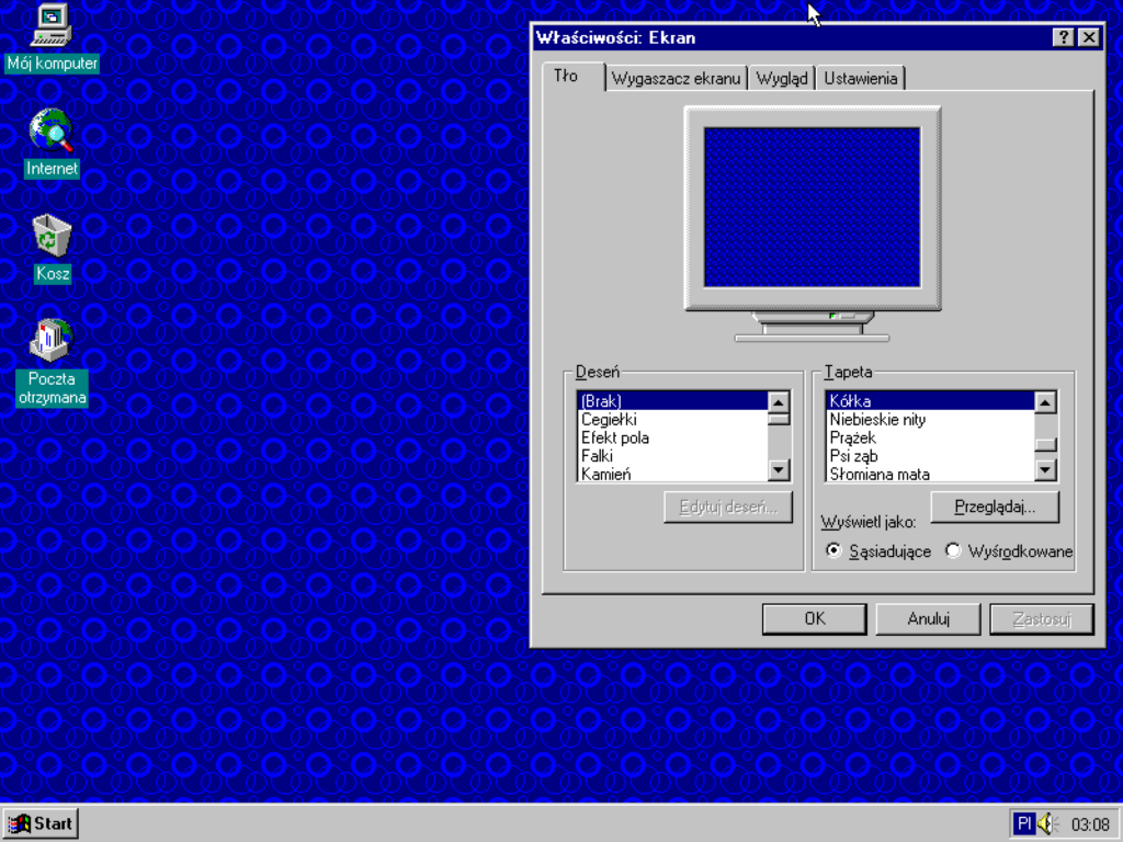 Inna opcja to użycie małego obrazka i wyświetlanie go „sąsiadująco” czyli w formacie powtarzalnych kafelków. Dzięki temu nawet dwukolorowy obrazek czyni pulpit bardziej interesującym, w przypadku tapetki „kółka” kosztem niespełna dwustu bajtów pamięci.